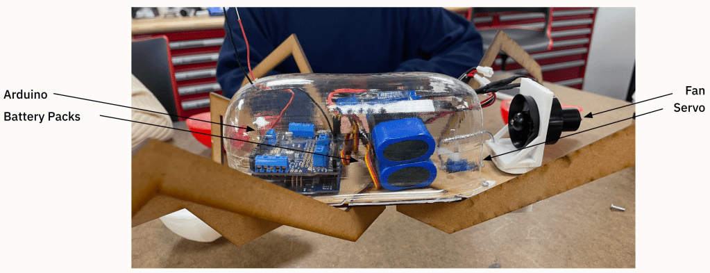 We also knew we needed to have something to propel the bug across the water, probably a fan. How would we control this fan? How would we power it while the bug is was moving? How do we make sure the bug stays dry, especially if we had electronics on board?