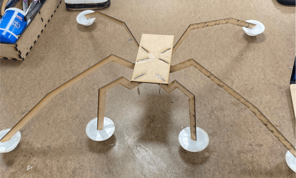 While creating bigger feet we also rethought the shape to be more fluid dynamic. As most things go, while we recognized and addressed a number of large issues with our feet, a small detail slipped our minds. We cut the holes in the plexiglass the wrong way! We fixed this by printing MDF pieces that could insert into the plexiglass vertically and the end of the bug’s leg horizontally, putting the feet back in the correct position.