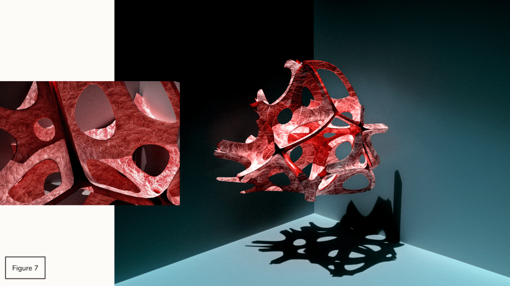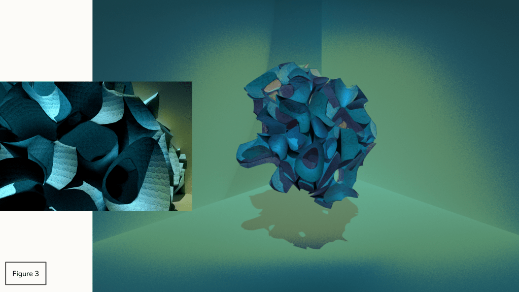 I wanted to present this project as a case study, starting with the current neon colored corals, and then progressing to a more and more abstract version of these corals throughout the essay, and possibly envisioning what they might look like should this situation worsen and waters continue to warm. I decided to place the corals suspended mid air in a blank corner with dramatic lighting to really emphasize the feeling of viewing them in a museum or exhibition environment, to convey researching or studying this climate event through these pieces of coral.