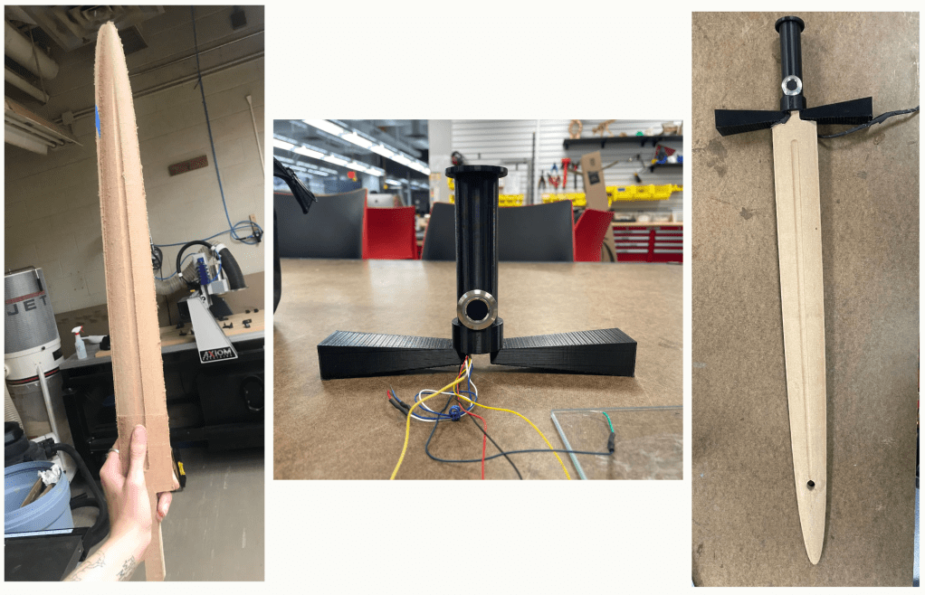 We first identified three main tasks to break the project down into: the sword, the fingerprint scanner, and the stone with its locking mechanism and light display. While we all helped and assisted each other along the way, I was tasked specifically with modeling and fabricating the sword and working to create its locking method along with Zahra who was on “stone”/LED duty.