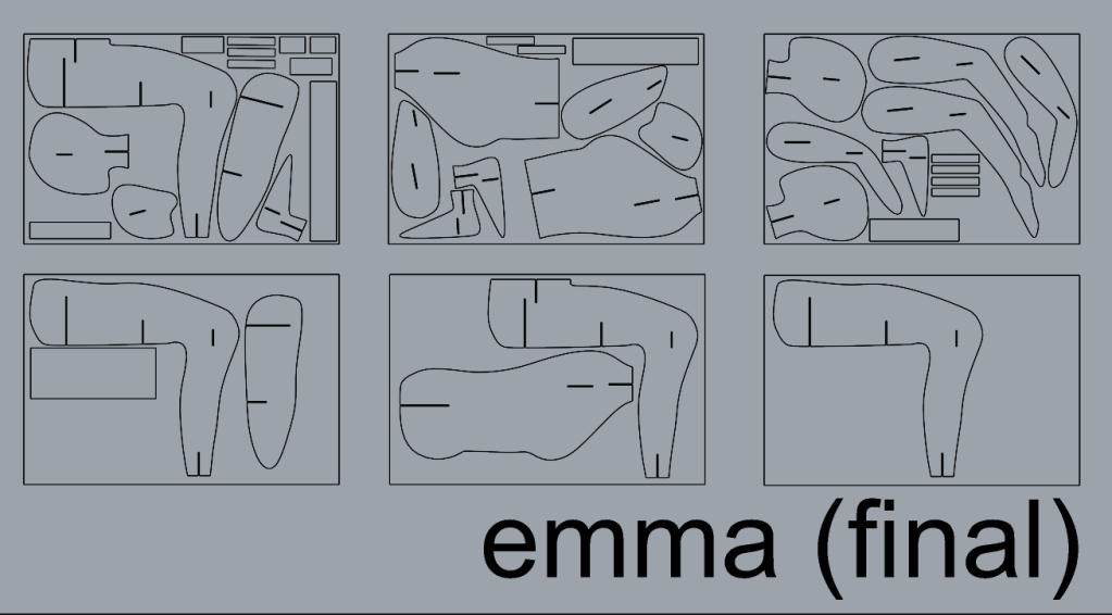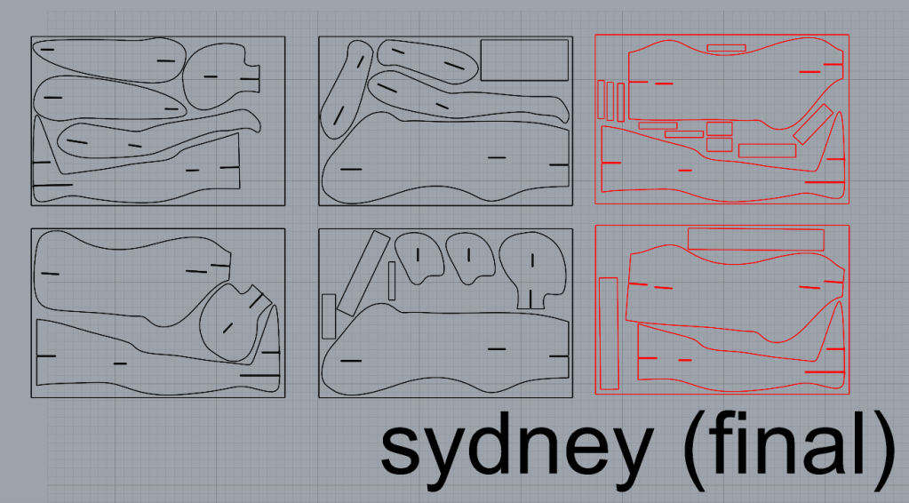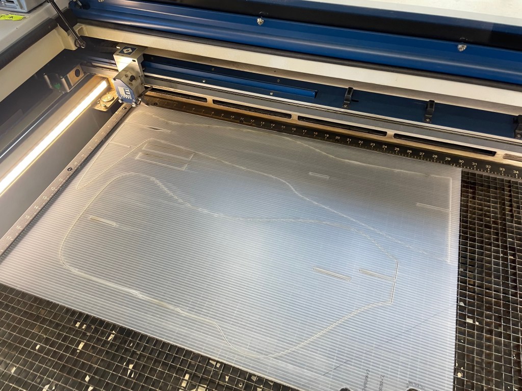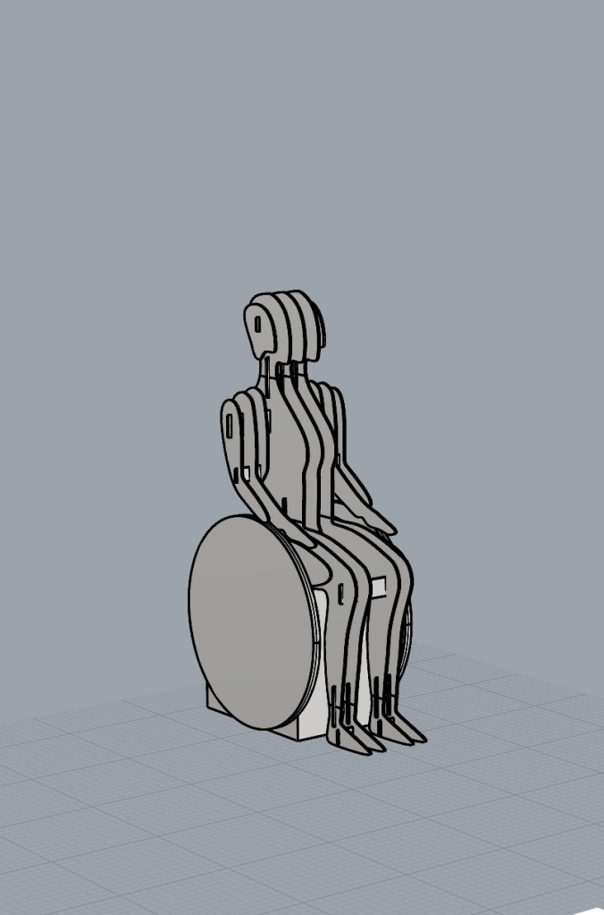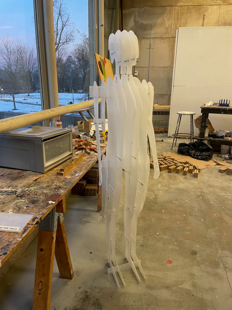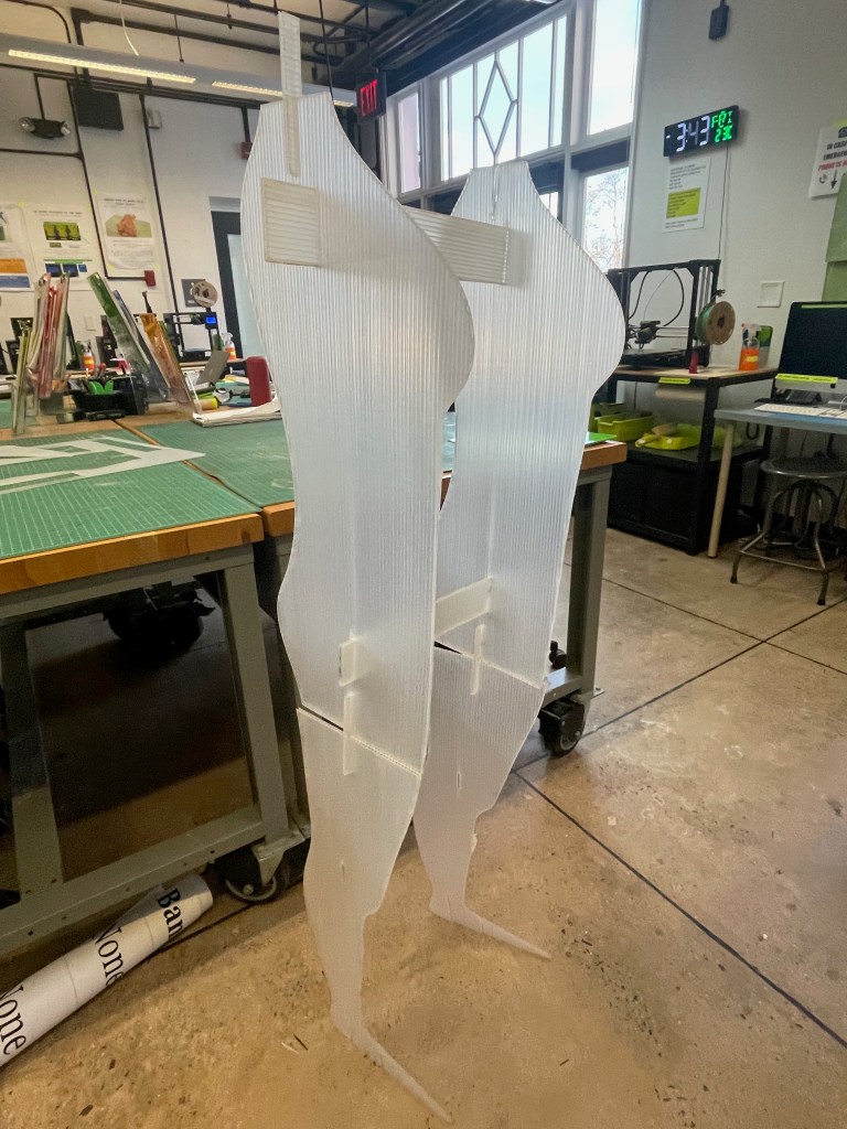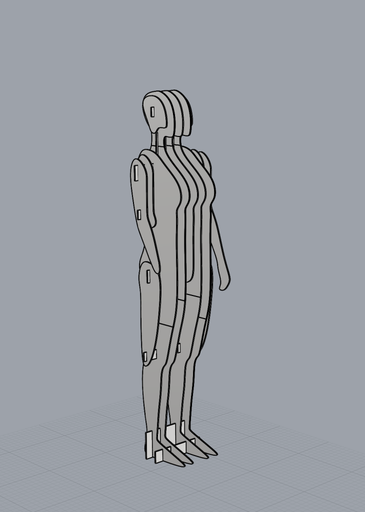 One significant problem I ran into was that both the laser cutting bed and corrugated plastic sheets were too small to fit a whole persons height in (20x30inches is what I ended up using). I ended up cutting each person into three sections, staggering the cuts in the thighs for better stability and connecting them with small horizontal rectangles also cut from the corrugated plastic sheets [see above images and videos].