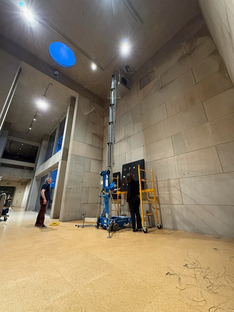 I intended to hang the sweaters and extra versions of each of the patches in North Gallery. In order to do so, I consulted a lot with Paul Theriaults, the lead art preparer for Zilkha, who came up with a plan to suspend five poles from the ceiling that would then told the sweaters in the air by clear fishing line.